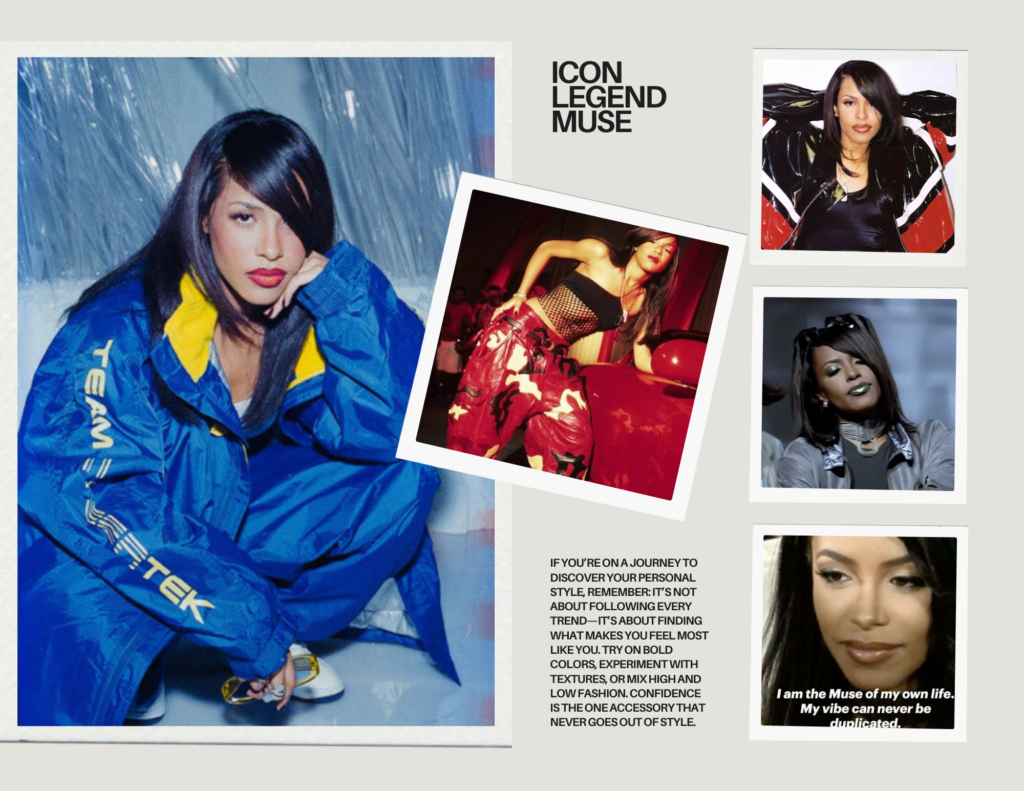 Growing up, Aaliyah was it. She gave us softness wrapped in oversized silhouettes, confidence that didn’t need to shout. I wanted to be her. I even got my first relaxer because she was on the box of the Alternatives relaxer—those bone-straight layers had me in a chokehold. Her tomboy chic defined my childhood and still influences how I mix masculine and feminine today.